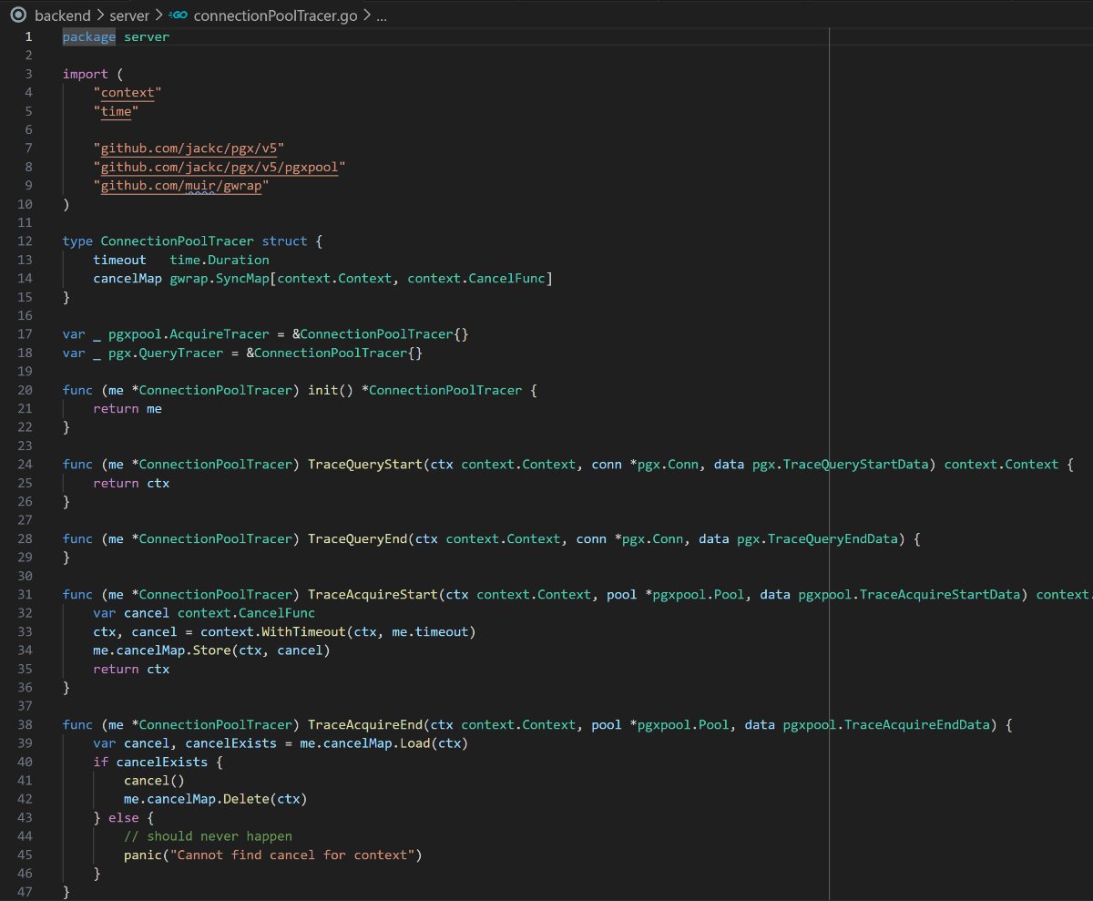 Letzte Woche habe ich meine Website auf PostgreSQL migriert und diese Woche einen interessanten Bug 🐞 entdeckt. Es scheint, dass der Go-Treiber für PostgreSQL keine Verbindungstimeout hat. Wenn mein Programm versucht, eine neue Verbindung zur Datenbank herzustellen, während die Verbindungsgrenze erreicht ist, kommt es zu einer Endloswartung. Warum das so ist, weiß nur der Autor der Bibliothek. Es ist unmöglich, einfach einen Timeout festzulegen. Man muss komplexen Code mit Kontexten schreiben, wie auf dem Screenshot zu sehen. Ich denke, dass context.Context eine ziemlich frustrierende Funktion in der Programmiersprache Go 🤔⚙️ ist.
