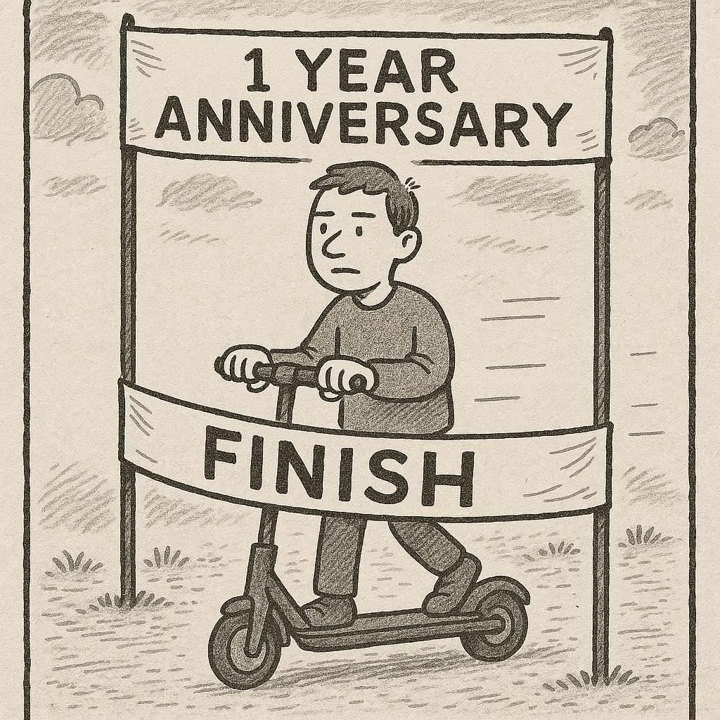 One year has passed since I bought my Xiaomi 4 Lite 2nd gen e-scooter. 🎉 I've made 250 trips in 365 days.