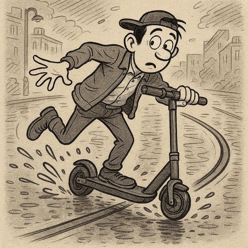 На этой неделе была такая неприятность: я ехал на самокате после дождя, и колесо заскользило на трамвайных рельсах. Произошёл дрифт, и самокат выскочил у меня из-под ног. Пришлось бежать за ним несколько метров, прежде чем самокат остановился. Случилось настолько быстро и неожиданно, что я даже не успел испугаться. Осознание "а что вообще произошло?" наступило уже после того, как инцидент закончился 🥴 Было опасно, но обошлось без синяков. Думаю, нужно избегать трамвайные рельсы в мокрую погоду.